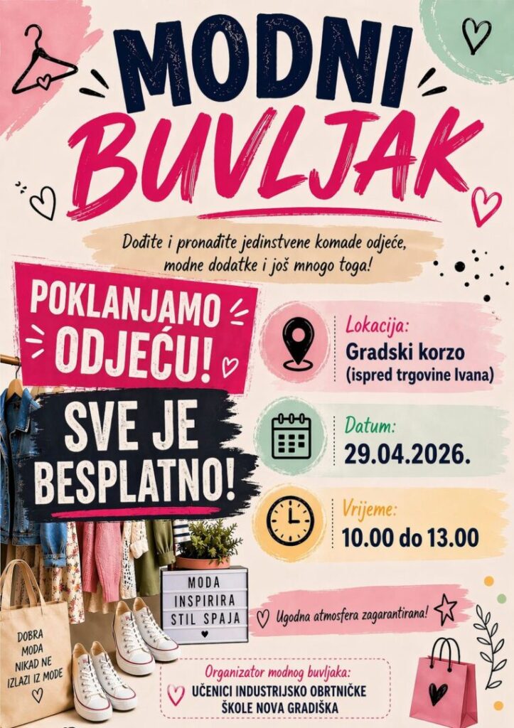 U srijedu, 29. travnja, od 10 sati, na gradskom korzu (ispred trgovine Ivana) održava se modni buvljak u organizaciji učenika Industrijsko-obrtničke škole.