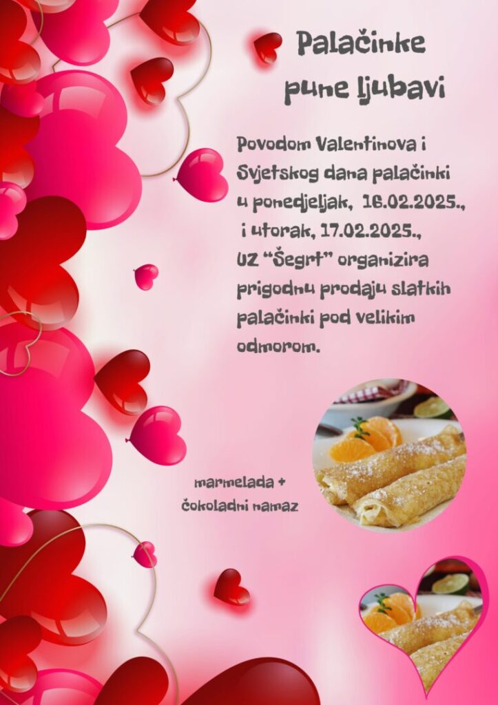 Povezujući Valentinovo i Svjetski dan palačinki, UZ „Šegrt“ organizirala je prigodnu prodaju palačinki. U projektu sudjelovali su učenici 1. i 2. razreda zanimanja kuhar, pomoćni kuhar i prodavač. Slatki ponedjeljak i utorak prošao je u ugodnom druženju učenika i nastavnika.“