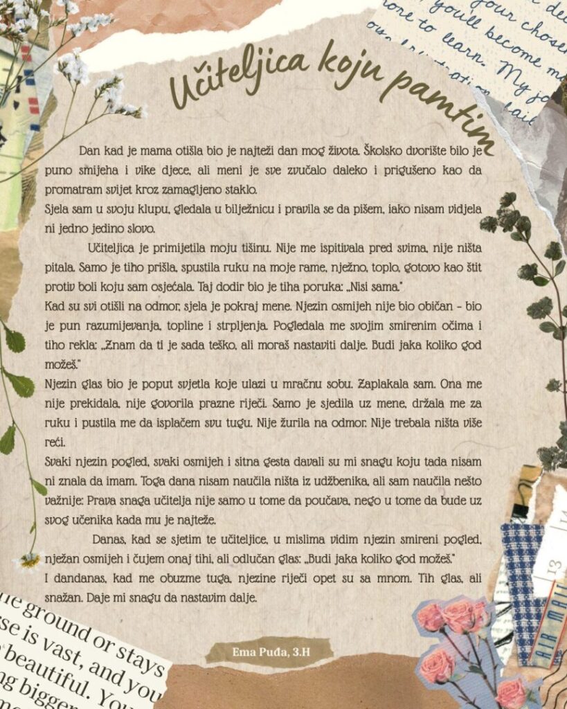 Čestitamo Emi na zasluženoj pohvali, a svim našim učenicima zahvaljujemo na sudjelovanju, predanosti i kreativnosti koju su pokazali. Vaše su riječi dokaz da učitelji doista ostavljaju neizbrisiv trag te da se njihove pouke, podrška i dobrota pamte zauvijek. Ponosni smo na vas jer ste pokazali da istinska vrijednost nije samo u nagradama, nego u hrabrosti da podijelite svoje misli i uspomene. Neka vas ovaj natječaj nastavi nadahnjivati da pišete, istražujete i otkrivate ljepotu riječi. Zadržite onu iskru motivacije koju ste pokazali u svojim radovima – baš onakvu kakvu su u vama budili učitelji koje ćete pamtiti.